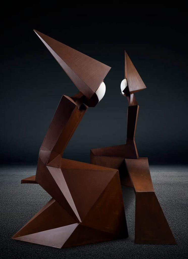 Inner Self series captures the encounter with the self and self-analysis of the ego from an intimate position. Starting from a reflection on femininity represented by a character sitting alone on a bench, the idea took on a new dynamic and shape; the work is soon completed by a male partner, who mirrors and completes it. It is about the essentialized image of a couple, fixed in a permanent form.